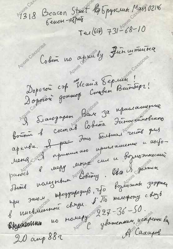 Письмо И.Берлину и С.Вейнбергу о согласии войти в состав Совета архива Эйнштейна