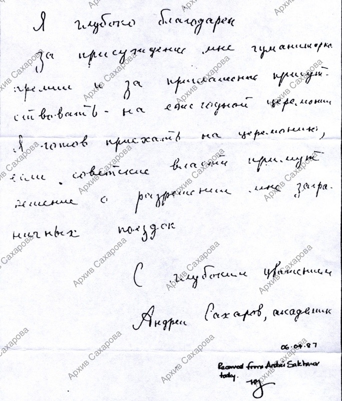 перевод письма Сахарова на англ. язык, сделанный в посольстве - 1 л.