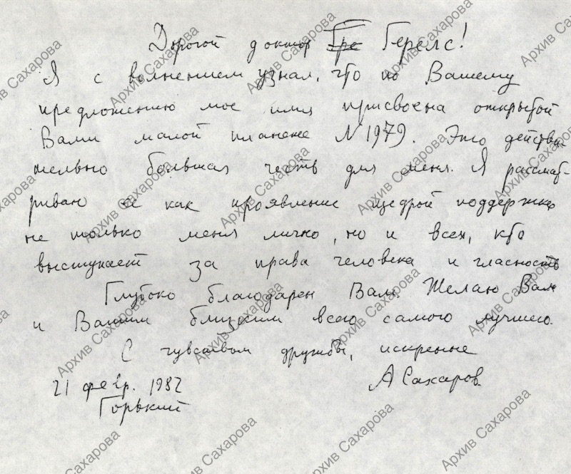 Телеграмма д-ру Тому Герелсу с благодарностью за присвоение открытой им малой планете имени Сахарова