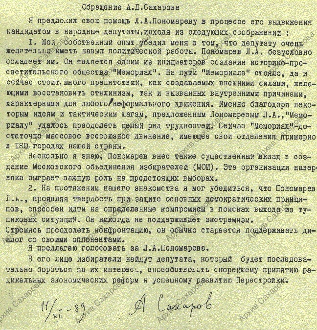 "Обращение А.Д.Сахарова" в поддержку кандидата в народные депутаты РСФСР Л.А.Пономарева