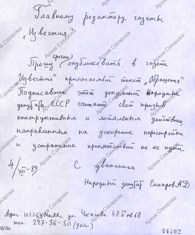Письмо главному редактору газеты "Известия" И.Лаптеву с просьбой опубликовать обращение депутатов о предупредительной забастовке