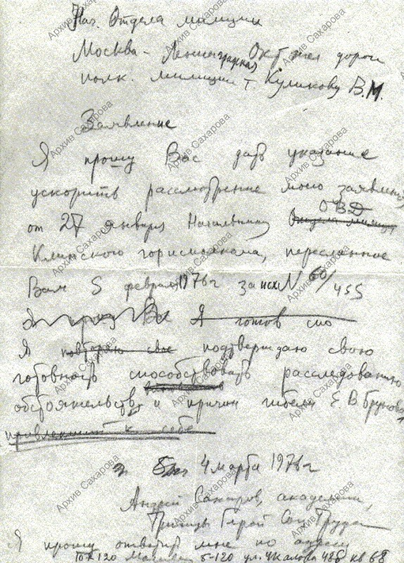 "Заявление" начальнику отдела милиции Октябрьской железной дороги Москва-Ленинградская В.М.Куликову с просьбой ускорить рассмотрение заявления о гибели Е.В.Брунова